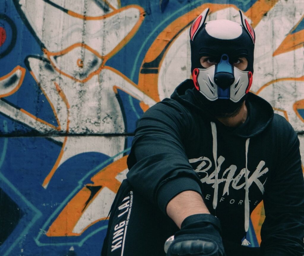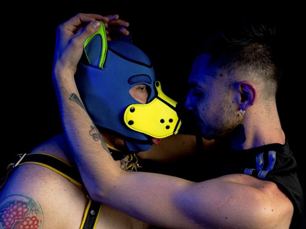 Dentro de este universo, nos encontramos con la comunidad puppy play, un grupo en su mayoría conformado por hombres gay, cuyo sello distintivo es el uso de máscaras o hoods que imitan la cabeza de un perro. En este roleplay, sus miembros se equipan con arneses, correas y collares para adoptar las características de un perro: ladran, gruñen y mueven sus colas como parte de una dinámica que combina el juego, la identidad y la expresión.